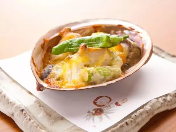 瀬戸内海の大きめの鮑を薄くそぎ、椎茸やグリーンアスパラなどと、特製味噌で和えてオーブンで焼き上げています。