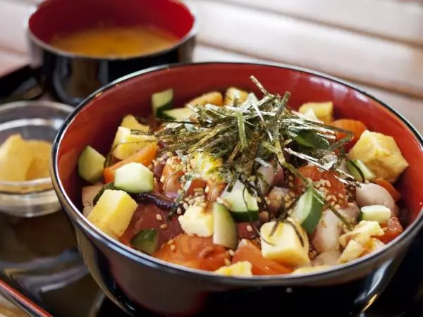 華やかな『あられ丼』はマグロをベースに、タコ、玉子などがご飯の上に散りばめられている