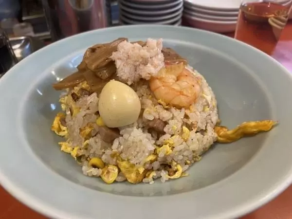 目を引かれるウズラの卵、そしてエビ、カニ、メンマがライドオン。華やかな五目ですが、もう一つの具材であるコーンがこのお店のチャーハンを唯一無二の逸品にするかくし味。コーンの甘みとメンマの食感がクセになってしまい、筆者はこのお店のチャーハンを月イチで食べないと発作が出てしまう身体になってしまいました。