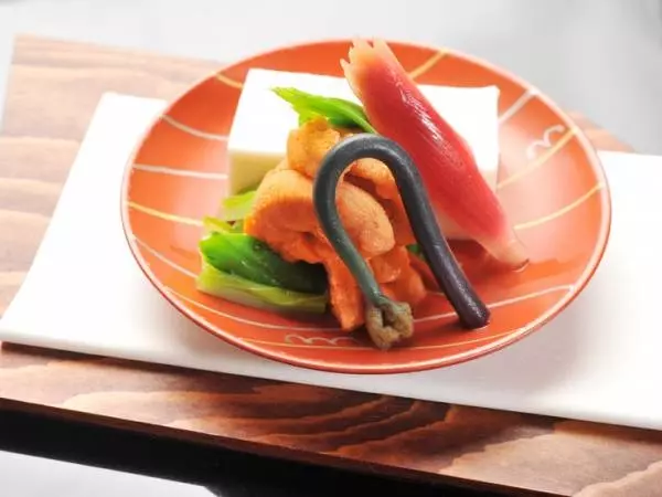 まろやかな味わいの鯛の白子豆腐。うるい、わらび、みょうがに雲丹を添えて(春の料理例)。※コースにより食材、調理法が異なります。 また、時期によって料理構成を変更する場合があります。