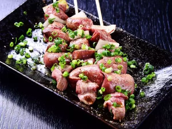 新鮮な鶏の白肝をサッとレア状態に炙り、ねぎを散らし、塩とゴマ油を振ってレバ刺し風に仕上げる『炙り鳥肝』
