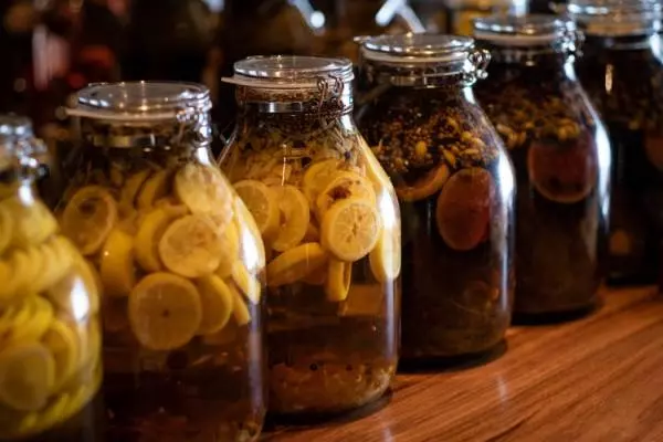 バーカウンターには漬け込み途中のお酒が数多並ぶ