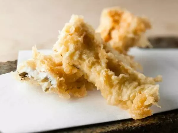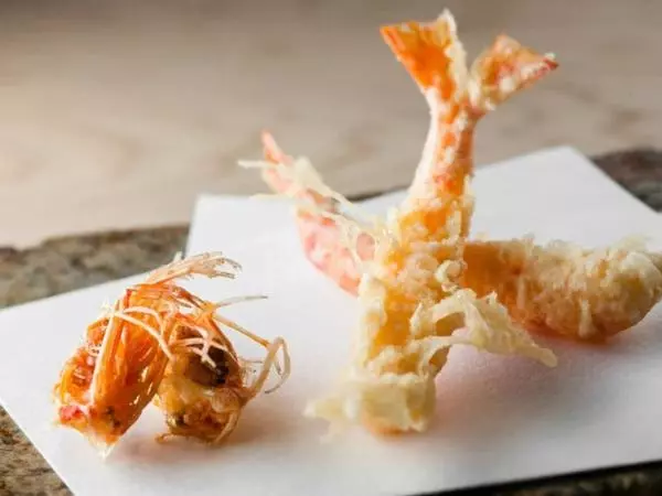 【天茂】では、新鮮な生きた車海老を天ぷらに使用します。目を離せば跳び回るような活きのいい車海老を手早くさばき、衣をまとわせてサッと揚げます。揚げたての車海老は、プリッとした身とカリッとした頭に分けられているので、それぞれの食感を堪能できます。