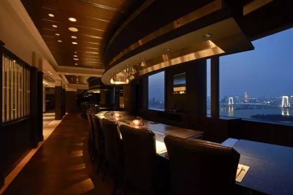 「グランドニッコー東京 台場」の30階にある【鉄板焼銀杏】。重厚感があり落ち着いた店内からは、東京を一望できるパノラマの景観が広がります。U字型カウンターで中央の鉄板を囲むように配席された個室や、テーブル席に鉄板が隣接した個室もあり、会食利用に最適です。食後のデザートは席を移動。さきほどとはまた違う景色を堪能できます。