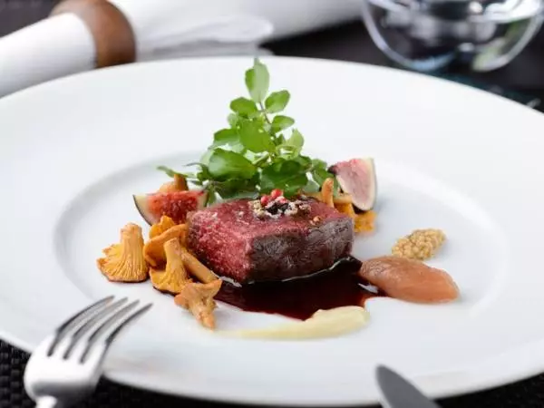 高級食材として知られる北海道の白糠産エゾシカは、素早く血抜き処理が行われるため、やわらかくて臭みがないのが特徴。じっくり丁寧に時間をかけて焼き上げられた鹿肉は、しっとり上品な舌ざわりに。赤ワインとビネガーのソースでさっぱり仕上げられ、ジロール茸と黒いちじくとともにいただきます。