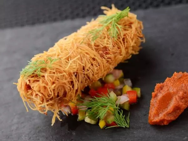 千葉県 銚子産の脂が乗ったイワシにスモーク風味のチーズを挟み、トルコ料理で使われる極細麵「カダイフ」で包んだ『銚子産イワシのカダイフ包み焼き』。料理の味やユニークな見た目に加えて、イワシのふんわり感やカダイフのパリパリ感といった、食感のバリエーションまで楽しめます。