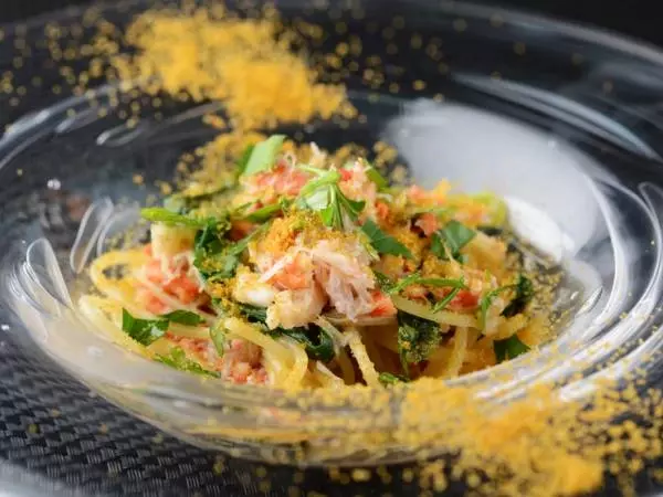 甘味たっぷりで身がしまった兵庫県 香住産ズワイガニを使用した『ズワイガニとからすみのスパゲッティ』。