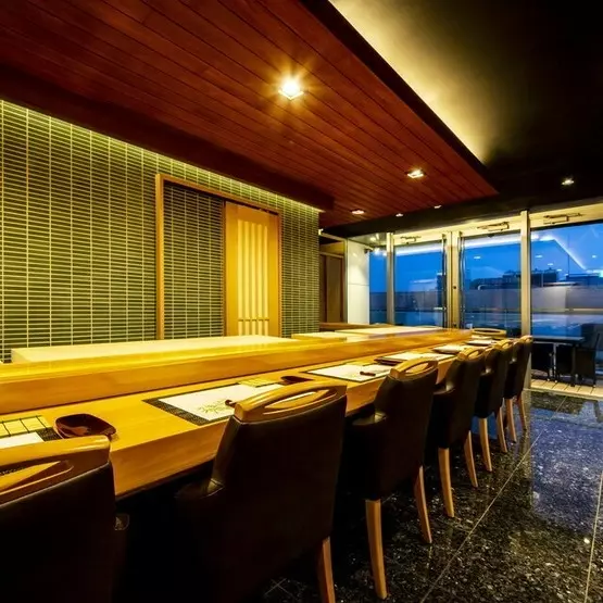 東京・銀座ミシュラン3年連続星獲得店がプロデュースする【難波鮨栞庵やましろ】。なんば駅から徒歩3分と駅近ですが、隠れ家のようにひっそりと佇むビルの中にあります。ラグジュアリーな雰囲気のこだわりの店内は、カウンター、半個室、完全個室、テラス席もある居心地のよいゆったりとした空間です。