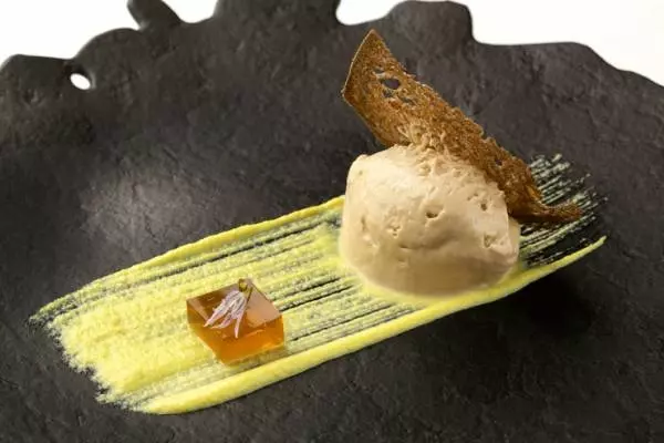 『ペドロヒメネス香るフォアグラ甘酸っぱいシュリービネガーのジュレ』は、スペインが世界に誇るシェリー“ペドロヒメネス”と、口どけのよい「フォアグラ」とのマリアージュを楽しめるスペシャリテの一つです。乳化させたフォアグラが、口の中でとろけるのをじっくりと楽しんで。