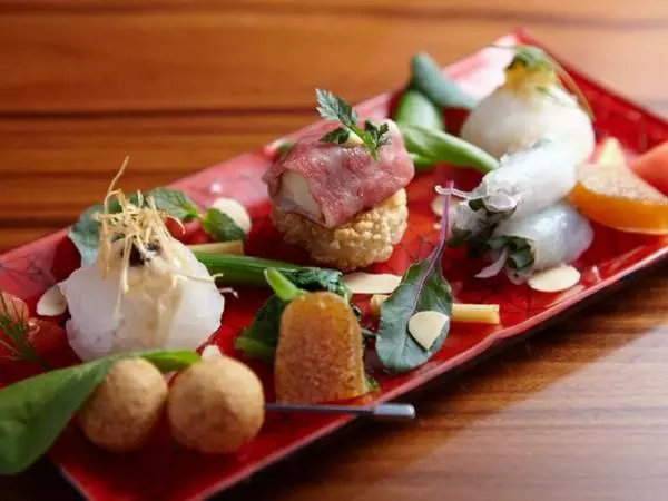 【ラ・ボンバンスLaBOMBANCE】で提供されるのはコース料理のみ。その中の一つの『3種の寿司が目にも鮮やかな野菜とともに』は、鮮やかな野菜をふんだんに使い、見た目も美しく盛り付けられています。小さな焼きおにぎりの上にあん肝を包んだ牛肉がのせられているなど、創作的な一皿には料理人の自由な発想が活かされています。