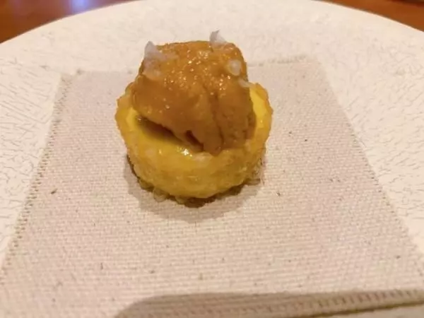 まずはスロベニアのスプマンテにあわせてトウモロコシの菓子に雲丹を乗っけたものを一口でいただきます。トウモロコシの甘さと雲丹の塩味が爽やかです。