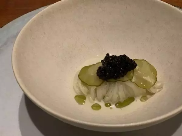 次に素麺です。発酵きゅうりとそのソースがかかっていて昆布の香りがします。それが出汁の風味と重なりキャビアとほどよくからみあいます。素麺は富山の大門の手延べでのど越しが気持ちいい。