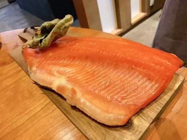 「信州サーモンは水がきれいなので臭みがなく身がしまっています。これは2日塩漬けにしたものを12日寝かせてたもので、40から42度で1時間半火入れします。皮の部分と中身をご用意します」