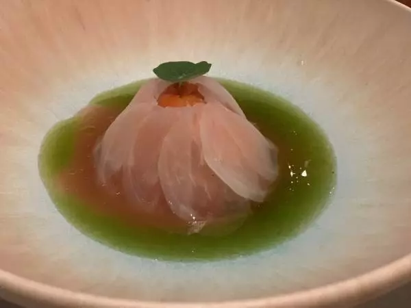 信州サーモンは口に入れた瞬間、むっちりとした食感があり、それが次第に口の中で蕩けるように広がっていきます。発酵食材の纏まり感が素晴らしく、それぞれが上手に引き立てあっている感じが素晴らしい。