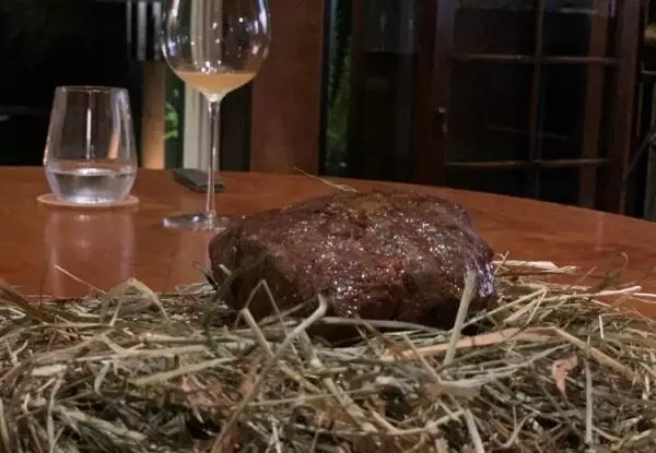 けっこう酔いも回ってきたころ、藁の上に乗っかった牛肉の塊が運ばれてきました。「ダボス牧場の短黒和牛です。無農薬で栄養価の高い牧草と発酵飼料を食べて育った健康で質の良い赤身肉だから肉の味が濃く旨味も強いです」とシェフ。