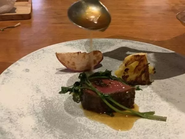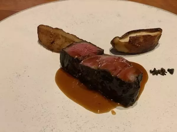 ダボスの肉にはこれを合わせてほしいと、地元は千曲川ファンキーシャトーのカベルネ・フランを合わせます。彼の地元愛の分かるペアリングで、カベルネ・フランの上質な舌触りがサーロインを引き立てていきます。