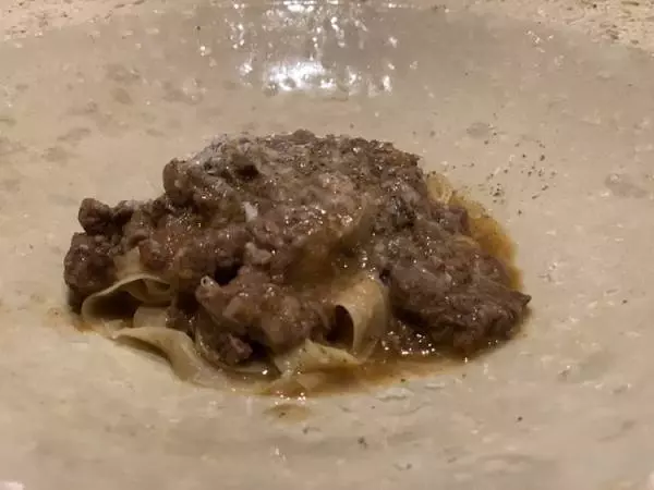 締めパスタにはローズマリーが練りこまれています。短黒和牛と香味野菜のラグーの香りがまた胃を開きます。