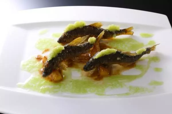 ここでしか味わうことのできない稀少な食材を探し、その食材でゲストに満足できる料理を提供することをモットーに掲げる【GINZATOTOKI】らしい一皿がこちら。高津川天然稚アユをフリットにし、すりおろしたきゅうりをゼリーとソースで仕上げた逸品です。天然アユのすがすがしい香りをゆっくりと堪能して。