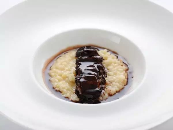 2年間熟成した干アワビを1週間かけてもどし、3日間かけて味つけされたこの料理は、独特な乾物系の香りと、海藻の香り、潮の香り、肝の味わい、アミノ酸の塊のような旨みがぎっしりと詰まった味を醸し出します。手間暇かけたアワビをスライスし、日本のおいしい米のリゾットに合わせると、口の中で深い味わいが広がります。