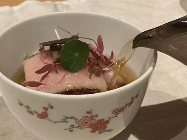 一つのコースで二人のシェフの料理を味わっていると、それぞれの個性がお皿から伝わってくるのも面白い。目黒さんの“発酵や旨みを重ねて深くなる料理”の印象とはまた違い、増永さんの料理は、シンプルだけれど、香りの余韻が長く続く。そんな増永さんの料理で印象的だったのは「金桜豚/味噌/コンソメ」だ。