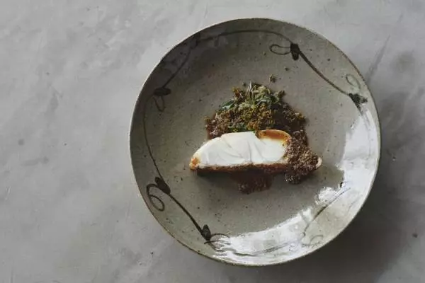 14代中里太郎右衛門の器に盛り付けられた美しいクエは、大胆にシンプルに焼きあげられている。添えられているのは、ツルムラサキと実山椒のソースと花山椒のピクルスだ。夏のクエは脂が少なくさっぱりとしている。実山椒や花山椒が生み出す野生的な野山の香りと刺激が、しっとりと仕上げた夏のクエの蛋白な味を爽やかに引き立てる。