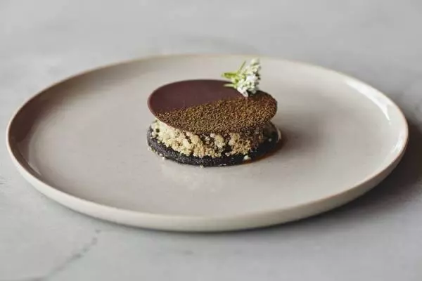 「チョコレート/ほうじ茶」は、チョコレートのテリーヌにクローブなどのスパイス、副島園のほうじ茶で香りをつけたもの。上にはかわいらしいそばの花があしらわれていた。