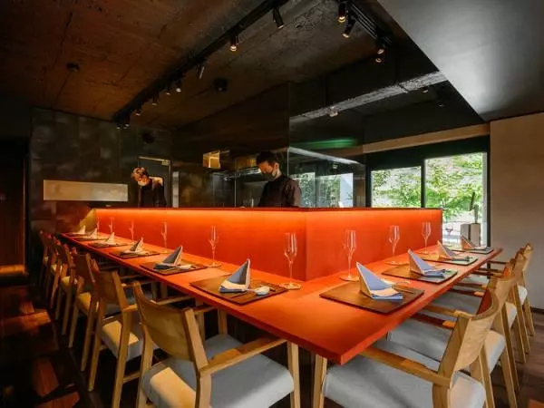 カウンターは10席。臨場感たっぷりのオープンキッチンながら、グッと落ち着いた大人の雰囲気