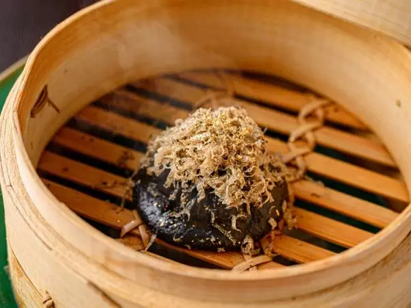 『黒トリュフのショウロンポウ〜熱々をお楽しみください〜』は通年メニュー。具は、粗挽きにした加藤ポークの腕肉と背脂。ジュワっと溢れ出るスープに妖艶なトリュフの風味が絡み、インパクトある味わい