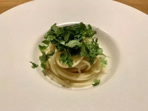 『蛤』は、千葉県のハマグリをたくさんかけたパスタで、パクチーがたっぷり乗っています。ハマグリの身は入っていないのに、とんでもなくハマグリを感じるのがすごくて、その旨みと絶妙な塩加減が細めのパスタによく絡んで至高。旨みたっぷりのスープを、最後の一滴まで飲み干してしまいました。