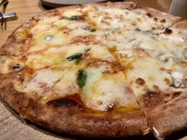 お店に入った途端目に入る大きなピザ窯が印象的な【ドンブラボー】さん。リストランテで本格的なピザが食べられるなんて……!席からピザができあがっていく様子を眺めるのも一興です。国産小麦の全粒粉とヨーグルトを使ったという生地は軽やかで、ここまでたくさん料理をいただいてきたのにさらっと食べられるのが不思議。マルゲリータとクアトロフォルマッジのハーフアンドハーフという、ピザ界の重鎮たちをコースの最後に味わえる幸せを噛みしめます。