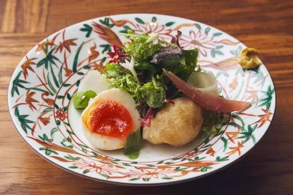 一見すると「どこにおでんの要素が?」と思わせるサラダ。存在感のある半熟卵とじゃがいものフリットはおでんだしで煮たものなのです。さいたま榎本農園の「ぜいたくトマト」はそのままでフレッシュに、みょうがは甘酢漬けにしてなど、7~8種類入った野菜はそれぞれの味わいが引き立つように工夫されています。からすみパウダーとパルミジャーノをふりかけてコクをプラス、添えた和からしで味の変化を楽しめます。