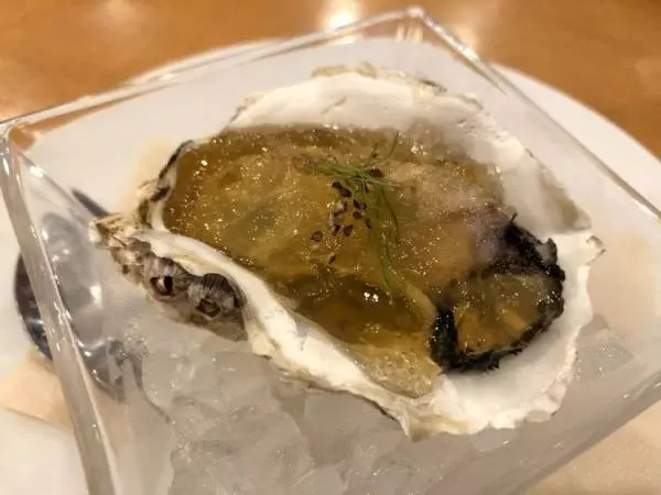 目黒駅から徒歩1分、大通り沿いのビル4階にある【F.PARADE Life】。牡蠣と黒毛和牛熟成肉が人気のお店です。早速お通しから心を掴まれた、牡蠣の一品。