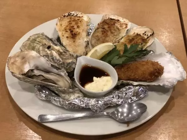 つづいて、牡蠣の盛り合わせが登場。左から時計周りに「焼き牡蠣」、「蒸し牡蠣」、「グラタン」、「ガーリックバター」、「ブルギニオン」、「カキフライ」。どれから食べよう、というワクワク感と味変で楽しめる牡蠣料理に大満足!