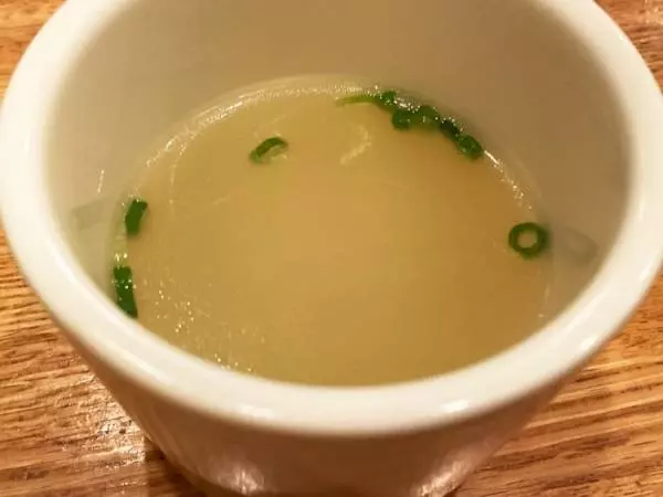 お通しに含まれている『鶏スープ』。しょうががほんのり香り、最後に胃袋をやさしく温める
