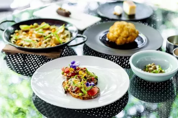 軽井沢の風が心地よいテラスダイニングでいただけるのは、世界最先端のガストロノミーレストランのエスプリ。日本の四季を感じながら、エネコ・アチャシェフの料理を楽しめるバスクビストロスタイルで、スペインの伝統的な料理『パン・コン・トマテ』や『アロス(米料理のひとつ)』などをエネコ流に昇華させた料理の数々を味わうことができます。