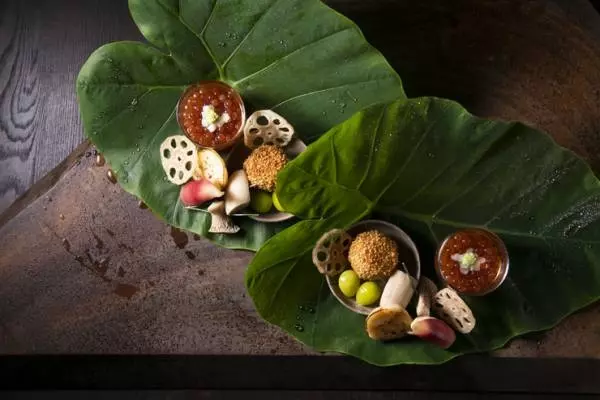 写真は9月の『八寸』の一例。中秋の名月、別名芋名月を表現し、芋の葉の上に新物いくら、ホタテ味噌漬け、小芋、新銀杏などを盛り付けています。