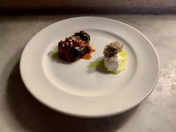 前菜の『ナスのカポナータ』は、旬ならではのトマトの甘みが幸せで、とろっとしたナスとナッツの香ばしさとの相性もよく、罪深いほどにお酒が進みます。『ブッラータチーズ』は上にトリュフが添えられていて、チーズの酸味に続いてふくよかに香ります。