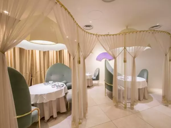 【厲家菜銀座】は北京に本店を置く、清朝時代の宮廷料理を楽しめるお店です。席ごとに異なる曲線を持つ翡翠色のハイバックのイスは中国の山麓を再現。雲をイメージしたライトシェードや霞のようなカーテンと相まって、山水画のような美しい空間が広がっています。