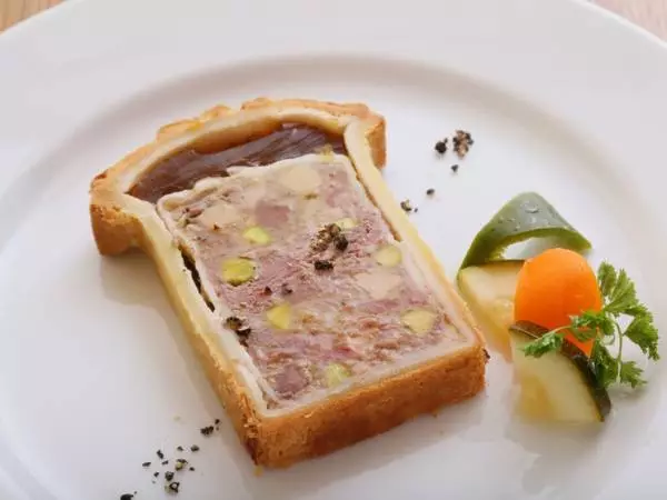 肉の旨みがたっぷりの『パイに包んで焼き上げた鴨とフォアグラのパテ』は、パイ生地の食感も楽しい