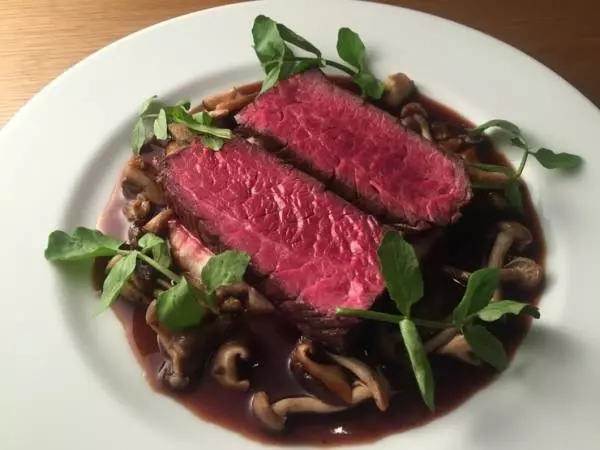 『牛ハラミのステーキ山葵風味の赤ワインソース』