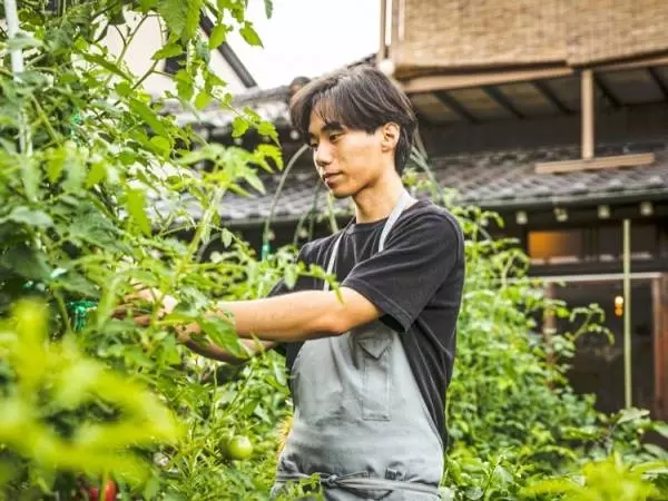 飛び石を渡って建物に近づくと、左手には菜園。ちょうど盛夏の始まりで、様々な種類のトマトをはじめ、ナス、ピーマン、ズッキーニなどなど、驚くほどたくさんの野菜が実り、あたり一面に青々しさが漂っていた。懐かしい香りだ。子供の頃、田舎の祖父母の家を訪ねたときの記憶が蘇るよう。そんなことを想いながらぼんやりと玄関に佇んでいると、中から一人の男性が姿を現した。【Restaurant KAM】のシェフ、本岡将さんである。
