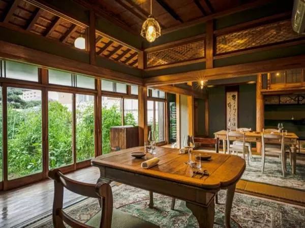 椅子を置いても圧迫された感じのない高い天井や、欄間に配された美しい組子細工、英国製のアンティークのテーブル。異質なものが違和感なく融合し、温かみのある雰囲気を演出している。そして、窓の外の緑あふれる菜園が目にやさしく、心をほどいてくれる。