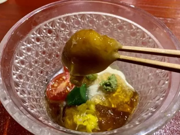 『先附』は、生湯葉、蒸しアワビ、飛騨の天然なめこ、フルーツトマトを土佐酢のジュレで仕上げています。ふわふわの湯葉は口のなかで幸せにとろけて、むっちりとした弾力のアワビが主役と思いきや、このなめこのインパクトたるや……!その柔らかくてフワッとした食感に驚きました。