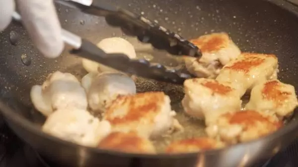 ⑦フライパンにオリーブオイルを加えて熱し、水気を切った手羽先の片面を色がつくまでこんがり焼く。