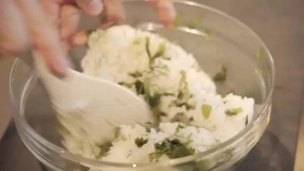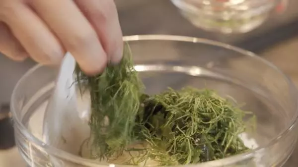 ⑧白米に刻んだわかめと大葉を加え混ぜ合わせ、器に盛り付ける。