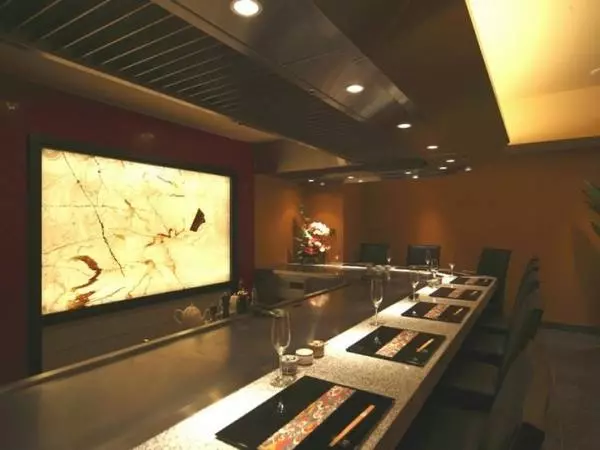 ホテルのレストランならではの高級感ある店内、大理石を施したカウンター席