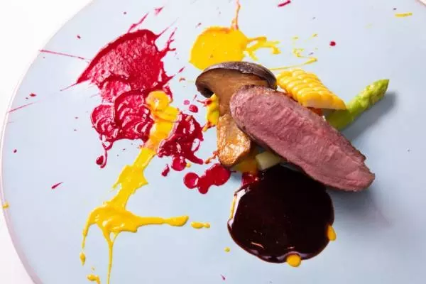 原色のソースがアートのように目に飛び込んでくるメインのひと皿