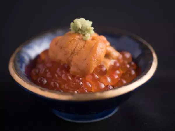 ほとんどのゲストがオーダーするという名物の『うに・いくら小丼』は、小さく上品な器にすし一貫分のシャリを入れ、その上にイクラ、ウニ、ワサビを盛りつける、“ひと口丼”風の寿司。ウニは春から秋は唐津、天草、志賀島など九州産を吟味して使用しており、禁漁期の冬は北海道産のものが使われています。