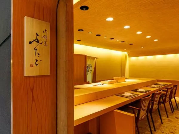 北新地駅から徒歩4分のビル1階にある【肉割烹 ふたご 北新地店】。「粋」「息」「意気」「活」など、大人の“IKI”がコンセプトの店内は、和の設えのモダンな空間。上質な和牛サーロイン、牛テールをはじめ、天然京筍や九条葱など、西日本を中心に全国から取り寄せたこだわりの食材が、目も舌も喜ばせてくれます。