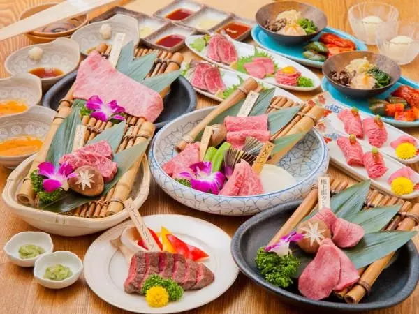 さまざまな部位を、さまざまな食べ方で楽しめる『黒毛和牛 厳選匠コース』。『お刺身三種盛』やお客様が焼き上げる『お肉の本日の吟選希少部位三種』、〆の『牛茶漬け』など、ワクワク気分を高めてくれる料理が目白押し。肉好きにはたまらない、大満足な時間が過ごせるでしょう。